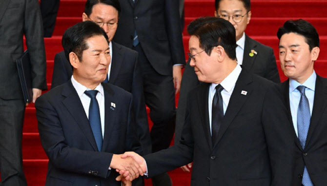 | | 이재명 대통령이 4일 국회에서 내년도 정부 예산안 시정연설을 마친 후 더불어민주당 정청래 대표(왼쪽)와 악수하고 있다.(대통령실사진기자단) |