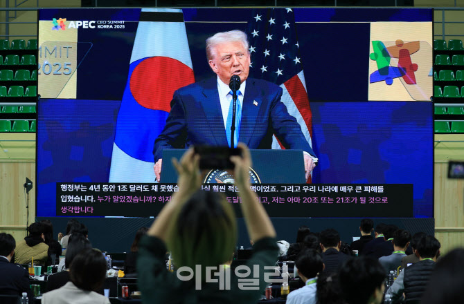 | | APEC CEO 서밋 개막일인 29일 오전 경주실내체육관에 마련된 비즈니스 미디어센터에 도널드 트럼프 미국 대통령의 특별연설이 생중계되고 있다. (사진=노진환 기자) |