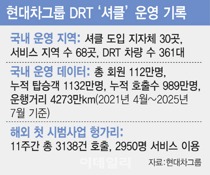 [이데일리 이윤화 기자] 현대자동차그룹의 인공지능(AI) 기반 수요응답교통(DRT) 서비스 ‘셔클(SHUCLE)’이 출시 4년 만에 국내를 넘어 글로벌 시장에서도 성공적인 시범사업 결과를 내며 활약 범위를 확장하고 있다. 대중교통 소외지역의 이동권 문제 해법에서 시작해 미래 자율주행 기술 발전의 ‘첨병’ 역할을 할 것이란 기대가 크다.