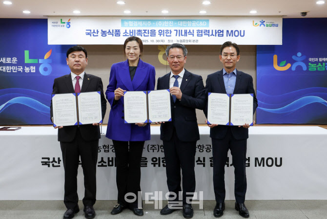 이날 행사에는 박서홍(왼쪽 세번째) 농업경제대표이사, 조현민(두번째) ㈜한진 사장, 노삼석(첫번째) (주)한진 대표이사, 최덕진(네번째) 대한항공 C&D 대표 등이 참석했다.