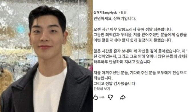 상해기는 최근 자신의 유튜브 채널 커뮤니티에 “오랜 시간 아무 말씀드리지 못해 정말 죄송하다”며 “그동안 죄책감과 두려움, 저를 믿어주셨던 분들에게 실망을 드렸다는 생각에 어떤 말을 꺼내야 할지 쉽게 결정하지 못했다”라고 밝혔다.