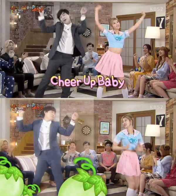 이날 방송에서 트와이스 사나는 일명 ‘샤샤샤’ 댄스로 큰 사랑을 받았던 ‘Cheer up’ 안무를 가수 존박과 함께했다.