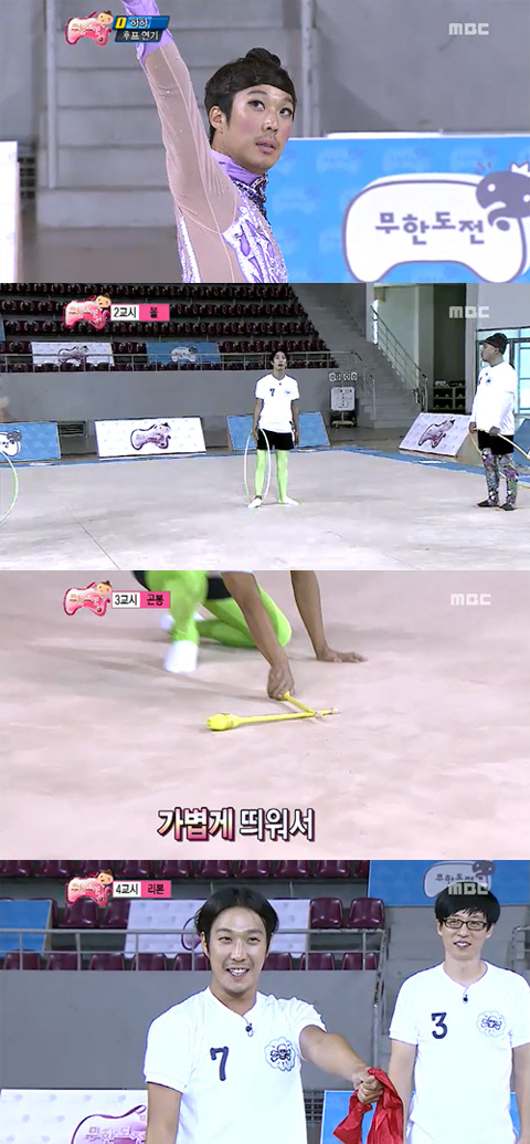 리듬체조 수업 후 이어진 공연에서 결국 하하가 유재석 노홍철 박명수를 제치고 1위를 차지했다. 이날 정준하는 손연재의 코치인 옐레나 니표도바로 분해 웃음을 자아냈다.