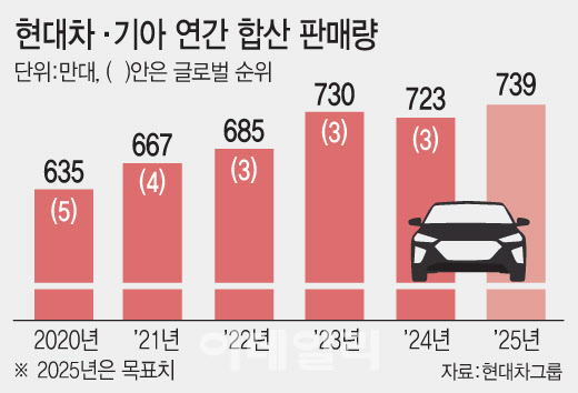 정 회장은 글로벌 완성차 시장의 격변기, 현대차그룹을 세계 3위 제조사로 안착시켰다. 그가 취임하던 2020년 현대차·기아의 합산 판매량은 635만대로 토요타, 폭스바겐, 포드, 혼다에 이어 세계 5위권이었다. 이듬해인 2021년 현대차·기아는 글로벌 4위로, 2022년에는 3위에 올라 현재 이 자리를 굳게 수성 중이다. 지난해 영업이익에서는 판매 2위 폭스바겐을 제치고 2위를 차지했다. 현대차그룹은 올해 판매 목표를 739만대로 상향하며 미국, 유럽 등 선진 시장 판매량을 확대 중이다.