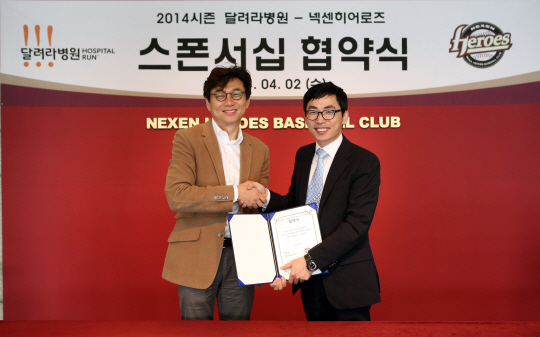 [이데일리 스타in 정철우 기자]넥센히어로즈는 2일 목동구장에서 척추·관절 치료 병원 달려라병원과 2014시즌 스폰서십(광고후원) 계약을 체결했다.