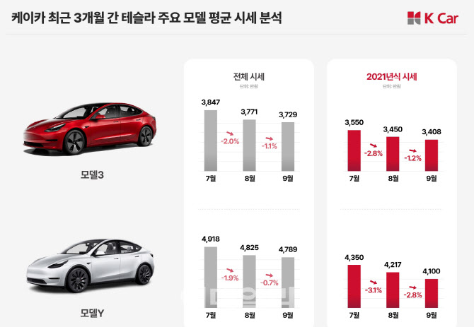 문제가 빈번히 제기된 2021년식 차량의 하락 폭은 더 컸다. 모델3는 8월 2.8%, 9월 1.2% 떨어졌고, 모델Y는 같은 기간 3.1%, 2.8%씩 하락했다.