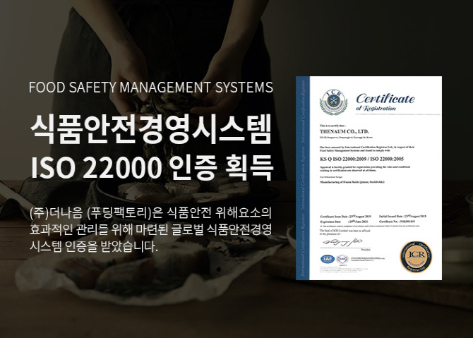 푸딩팩토리는 ISO22000 인증을 위해 지난 6월부터 사전 심사와 제조시설 검증, 서류 심사 등 까다로운 절차를 거쳐 최종 인증을 획득했다.