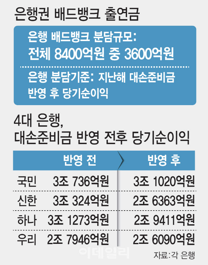 [단독]3600억원 은행권 배드뱅크 분담기준 가닥…'국민>하나>신한銀'